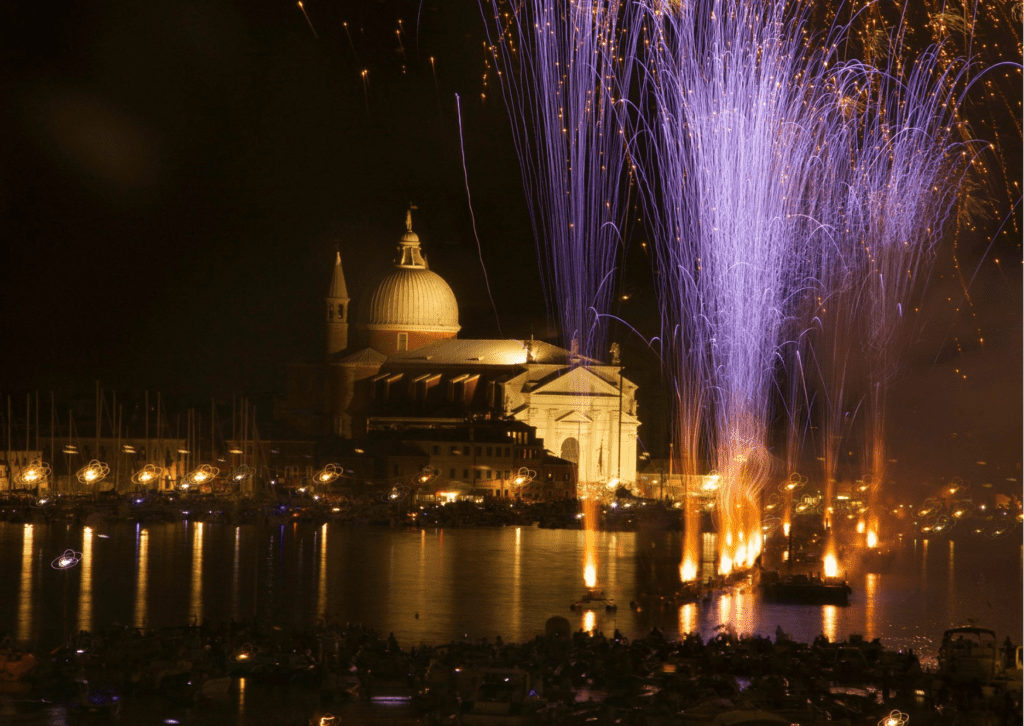 Après le dîner, l’expérience se poursuivra par le moment le plus attendu de la soirée : le spectacle pyrotechnique de minuit. À bord d’un élégant taxi bateau, vous rejoindrez le Bassin de Saint-Marc, d’où vous pourrez admirer les feux d’artifice depuis un point de vue privilégié, loin de la foule et plongés dans une atmosphère intime et romantique.